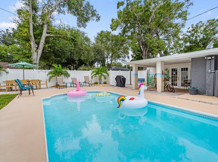 Amenities Included…. KITCHEN: • Dish Soap and Dishwasher Tabs • Plates, Bowls and Cups • Knives • Keurig with KCups • Coffee Pot • French Press for Tea • Electric Tea Kettle • Blender • Toaster • Crockpot • Mixing Bowls • Cooking Utensils • Spice Rack • Cutting Boards • Baking Sheets • Bar Stools • Booster Seat GAME ROOM: • Shuffleboard Table • Ring Toss • TV • Cozy Seating • Cabinet with Games • Dry Bar with Mini Fridge • Glassware • Cocktail Shaker BATHROOMS: • Shampoo, Conditioner and Body Wash • Hand Soap • Hair Dryers • Magnified Makeup Mirror • Bath Towels, Wash Cloths and Makeup Towels • Beach Towels BEDROOMS: • Luggage Racks • Hooks • Ceiling Fans • 1 Floor Fan • Dressers/Clothing Storage • Hangers • Work Desk (Queen Room) • TVs • Blankets • Pack n Play OUTDOORS: • Inground HEATED Pool • 2 Bikes • Beach Chairs and Umbrella • Multiple Seating Areas • Dining Table for 8 • Corn Hole Board • String Lights • Mural of Indian Rocks Beach • Covered Area w/Ceiling Fan • Tree Swing LAUNDRY ROOM: • Washer and Dryer • Laundry Detergent • Iron and Ironing Board • Broom • Mop