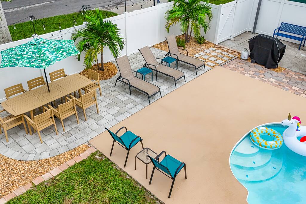 NOTE: our pool screen cage has been removed since the photos were taken. Equipped with 3 bedrooms, 2 baths, gameroom/den, dining room and a full kitchen with all the amenities. The home has central air to keep you cool. Great back yard and additional outdoor space that includes a covered, heated in-ground pool, hot tub and patio. Brand new furniture including super comfy beds for a great nights sleep after your day of recreation. Smart TVs in every room and Wifi throughout the home. Easy, one level living in this bright airy home. Sheets and towels are all included as well as the use of the washer and dryer if needed. And, of course, we provide all the beach essentials like towels and chairs for your use while you are our guests. LIVING ROOM: Newly remodeled, bright and airy space with beautiful new furnishings. The living room boasts an open floor plan which flows into the dining room and the remodeled kitchen and out onto the covered patio leading to the pool. Roku Smart TV. Super comfortable sectional and chairs for relaxing after a hard day at the beach! KITCHEN: Fully equipped kitchen with brand new appliances and plenty of workspace. Also a bar area for seating as well as separate seating area. Great place to make a meal or just settle down for your morning coffee. DINING AREA: A nice big table for the whole gang....seats 8 comfortably. Also overlooking the pool. The open floor plan provides easy access between our kitchen, living room and dining area. GAME ROOM/DEN; An extra space for gathering, playing games including our shuffleboard table, having drinks, or just relaxing. PRIMARY BEDROOM: To ensure your comfort, our home is outfitted with luxury mattresses, quality linens, and great pillows, all cleaned to the highest standards. Our primary bedroom has a king size bed, dresser and plenty of space for storage as well as a smart TV for you. The bedroom leads into a luxurious en suite bathroom with a vanity, stand up shower. All towels and amenities are selected with you in mind. QUEEN BEDROOM: Queen bedroom with high quality mattress, dresser and Smart TV. This room also boasts a separate workspace and a built in desk. TRUNDLE BEDROOM: Lots of options in this room. Either stick with the Queen bed or pull out to create yet another Full size bed. This cozy room is great for the kids or for any additional guests. SECOND FULL BATH: Another fully renovated, high end full bath with tub/shower and vanity. This can be used by any of the other guest and is conveniently located off the main section of the home. Quality towels and amenities provide. OUTDOOR AREA/BACKYARD: With some of the best weather in the country, our home offers the outdoor space to enjoy it. We have multiple spaces to experience. Our fenced-in yard boasts a heated in- ground pool, a covered patio seating area, lounge chairs, gas grill, and outdoor dining. Also, out the side door, there's an entirely different patio where you can enjoy your morning coffee or afternoon drinks. NOTE: pool screen was removed… but the pool is still in working order. Take in the sun and enjoy the space!