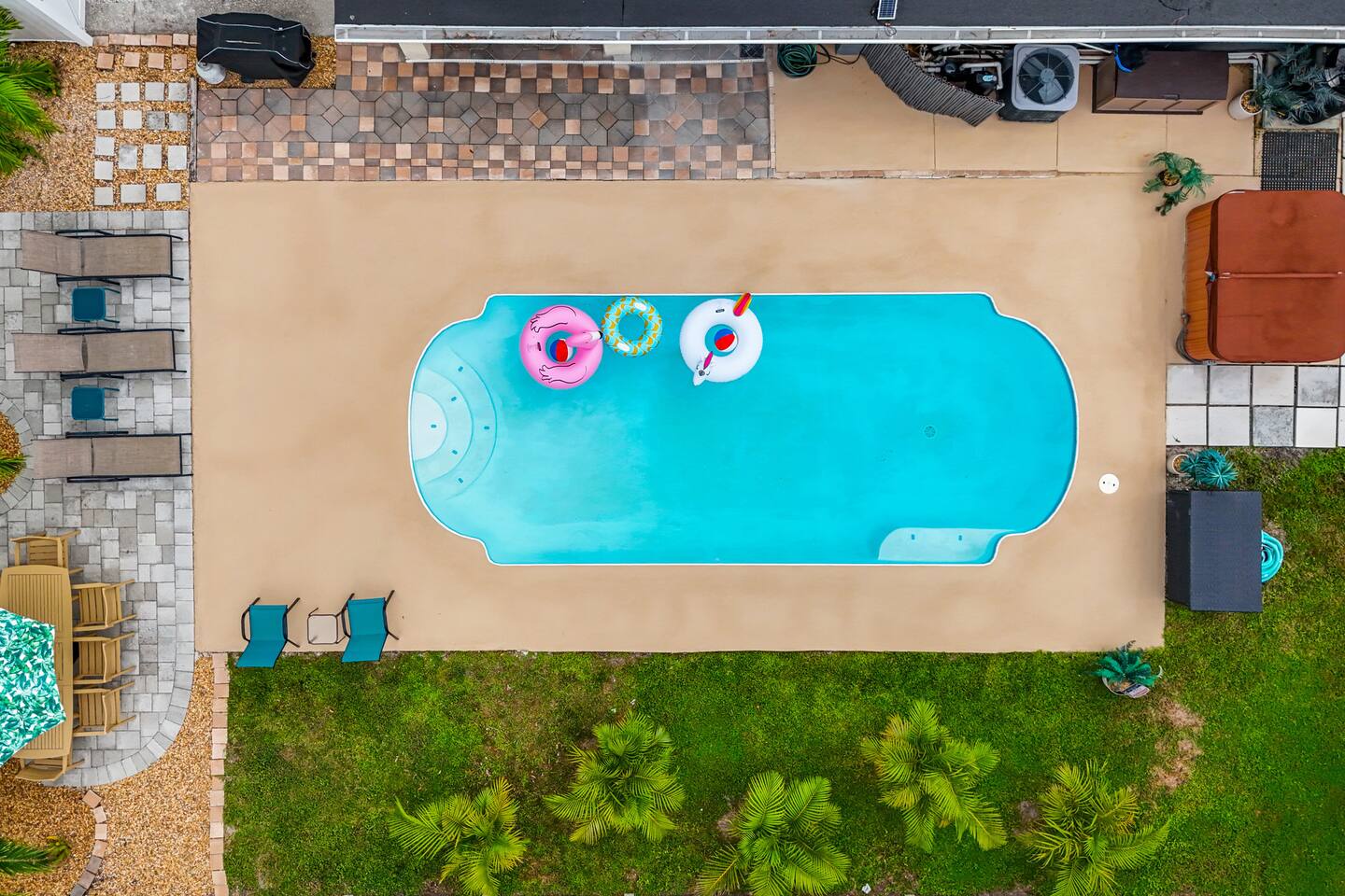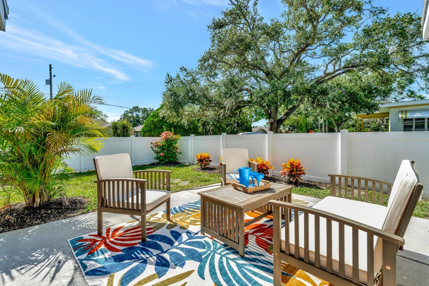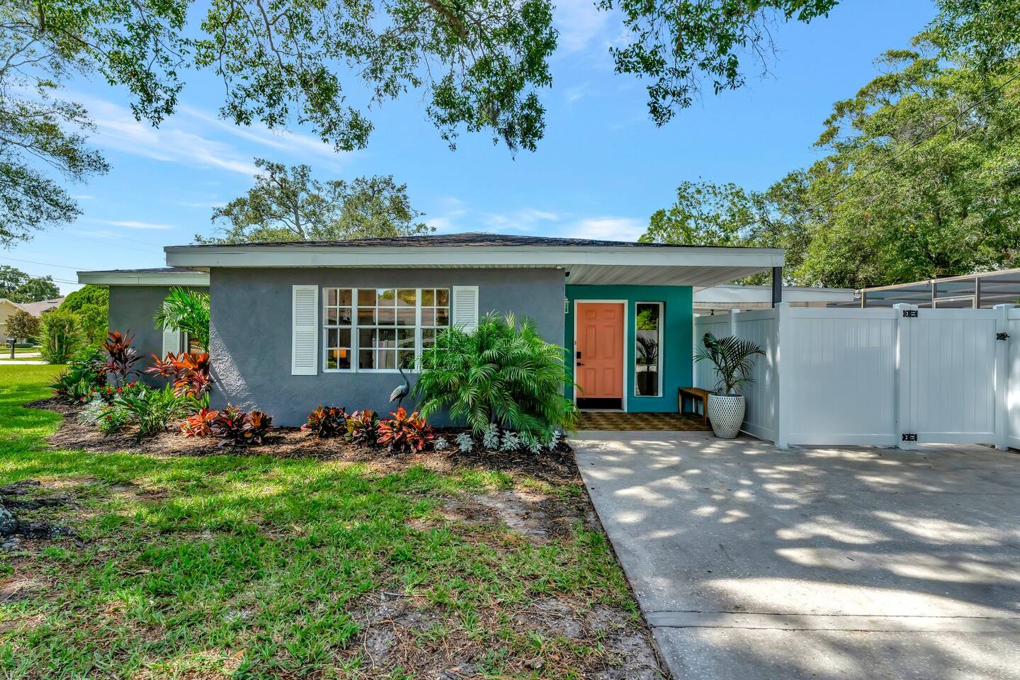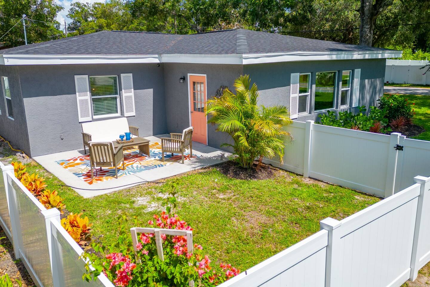NOTE: our pool screen cage has been removed since the photos were taken. Equipped with 3 bedrooms, 2 baths, gameroom/den, dining room and a full kitchen with all the amenities. The home has central air to keep you cool. Great back yard and additional outdoor space that includes a covered, heated in-ground pool, hot tub and patio. Brand new furniture including super comfy beds for a great nights sleep after your day of recreation. Smart TVs in every room and Wifi throughout the home. Easy, one level living in this bright airy home. Sheets and towels are all included as well as the use of the washer and dryer if needed. And, of course, we provide all the beach essentials like towels and chairs for your use while you are our guests. LIVING ROOM: Newly remodeled, bright and airy space with beautiful new furnishings. The living room boasts an open floor plan which flows into the dining room and the remodeled kitchen and out onto the covered patio leading to the pool. Roku Smart TV. Super comfortable sectional and chairs for relaxing after a hard day at the beach! KITCHEN: Fully equipped kitchen with brand new appliances and plenty of workspace. Also a bar area for seating as well as separate seating area. Great place to make a meal or just settle down for your morning coffee. DINING AREA: A nice big table for the whole gang....seats 8 comfortably. Also overlooking the pool. The open floor plan provides easy access between our kitchen, living room and dining area. GAME ROOM/DEN; An extra space for gathering, playing games including our shuffleboard table, having drinks, or just relaxing. PRIMARY BEDROOM: To ensure your comfort, our home is outfitted with luxury mattresses, quality linens, and great pillows, all cleaned to the highest standards. Our primary bedroom has a king size bed, dresser and plenty of space for storage as well as a smart TV for you. The bedroom leads into a luxurious en suite bathroom with a vanity, stand up shower. All towels and amenities are selected with you in mind. QUEEN BEDROOM: Queen bedroom with high quality mattress, dresser and Smart TV. This room also boasts a separate workspace and a built in desk. TRUNDLE BEDROOM: Lots of options in this room. Either stick with the Queen bed or pull out to create yet another Full size bed. This cozy room is great for the kids or for any additional guests. SECOND FULL BATH: Another fully renovated, high end full bath with tub/shower and vanity. This can be used by any of the other guest and is conveniently located off the main section of the home. Quality towels and amenities provide. OUTDOOR AREA/BACKYARD: With some of the best weather in the country, our home offers the outdoor space to enjoy it. We have multiple spaces to experience. Our fenced-in yard boasts a heated in- ground pool, a covered patio seating area, lounge chairs, gas grill, and outdoor dining. Also, out the side door, there's an entirely different patio where you can enjoy your morning coffee or afternoon drinks. NOTE: pool screen was removed… but the pool is still in working order. Take in the sun and enjoy the space!