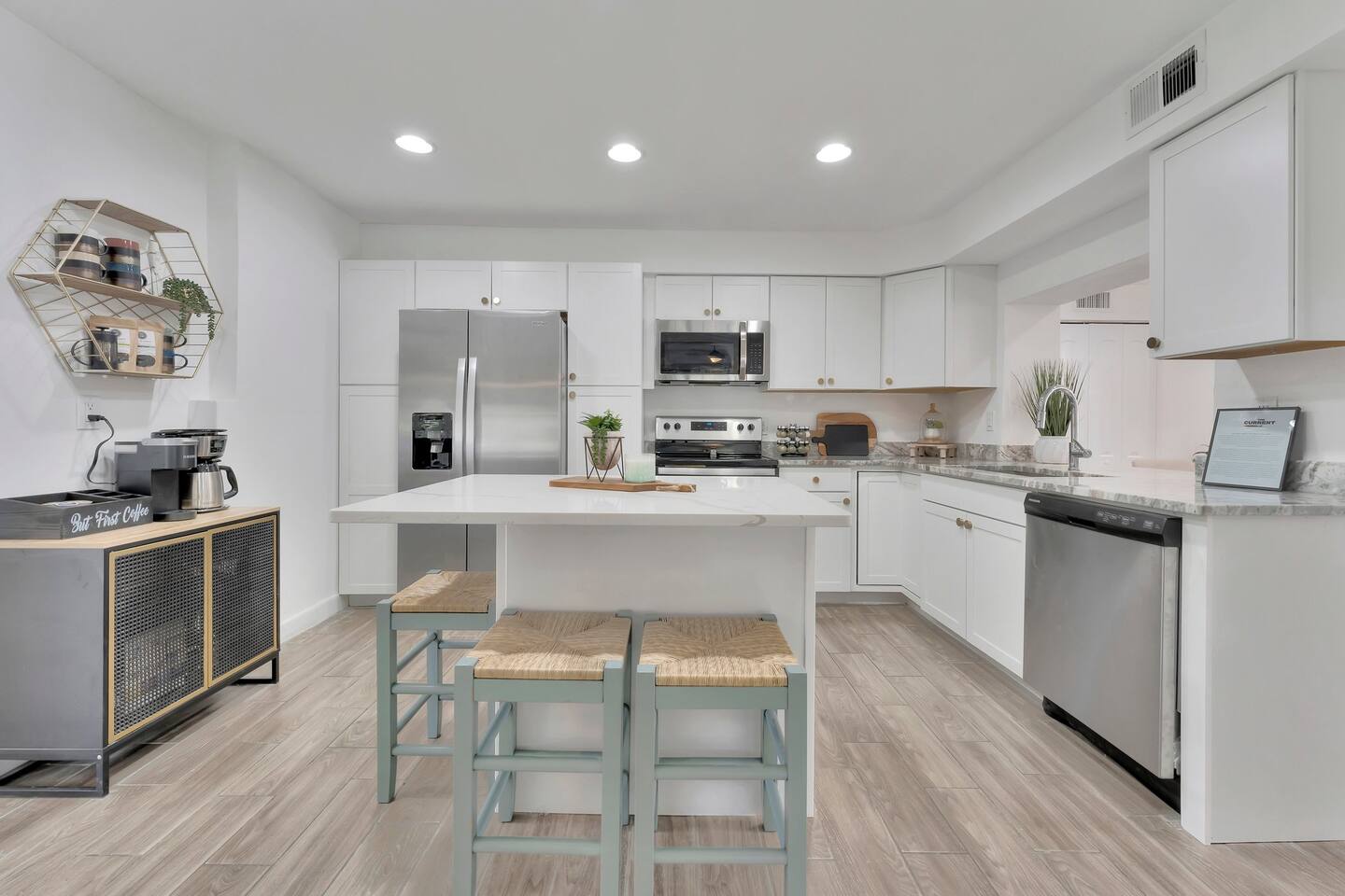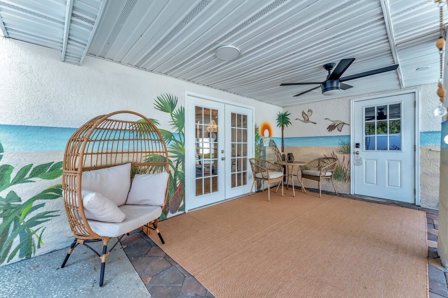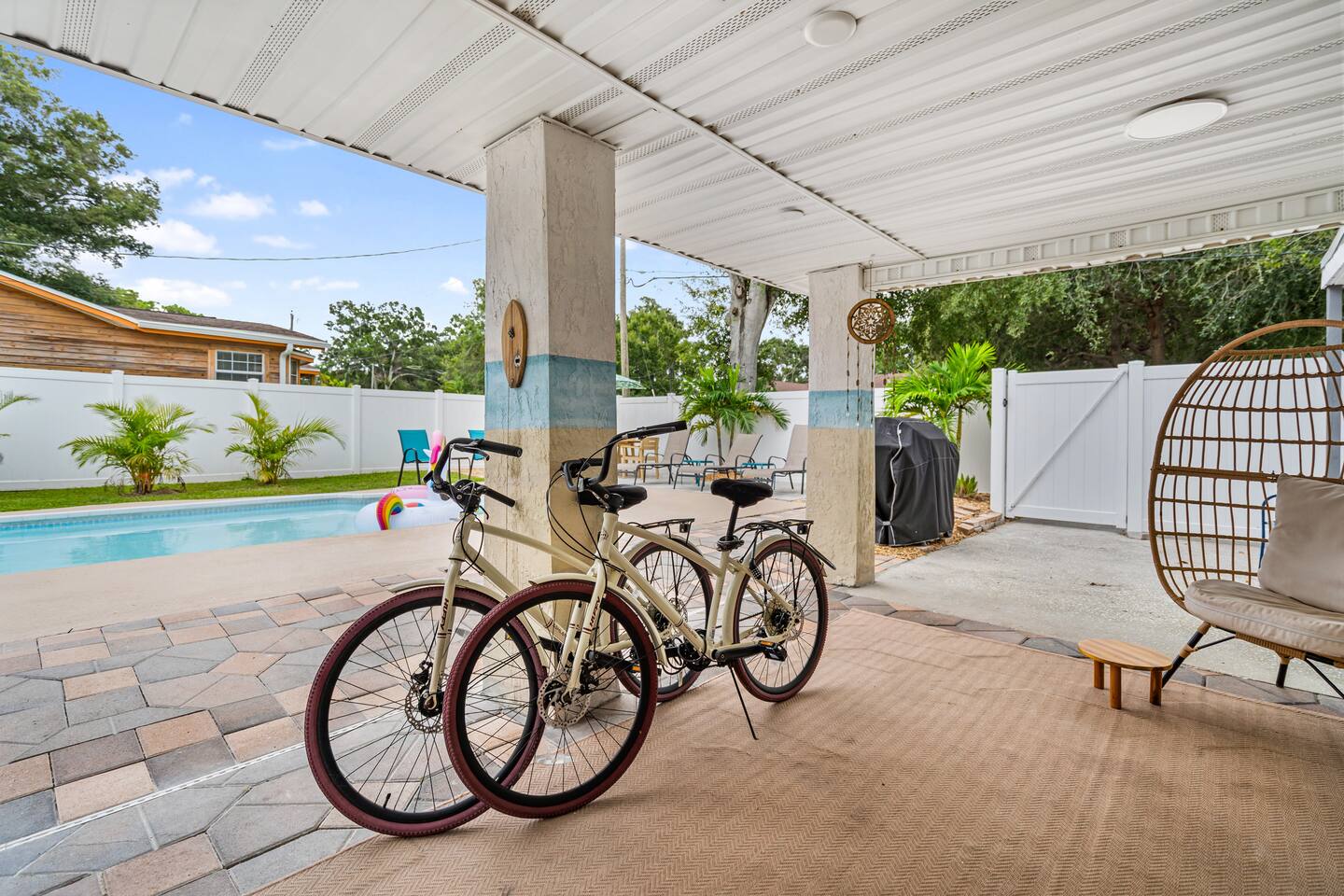 Amenities Included…. KITCHEN: • Dish Soap and Dishwasher Tabs • Plates, Bowls and Cups • Knives • Keurig with KCups • Coffee Pot • French Press for Tea • Electric Tea Kettle • Blender • Toaster • Crockpot • Mixing Bowls • Cooking Utensils • Spice Rack • Cutting Boards • Baking Sheets • Bar Stools • Booster Seat GAME ROOM: • Shuffleboard Table • Ring Toss • TV • Cozy Seating • Cabinet with Games • Dry Bar with Mini Fridge • Glassware • Cocktail Shaker BATHROOMS: • Shampoo, Conditioner and Body Wash • Hand Soap • Hair Dryers • Magnified Makeup Mirror • Bath Towels, Wash Cloths and Makeup Towels • Beach Towels BEDROOMS: • Luggage Racks • Hooks • Ceiling Fans • 1 Floor Fan • Dressers/Clothing Storage • Hangers • Work Desk (Queen Room) • TVs • Blankets • Pack n Play OUTDOORS: • Inground HEATED Pool • 2 Bikes • Beach Chairs and Umbrella • Multiple Seating Areas • Dining Table for 8 • Corn Hole Board • String Lights • Mural of Indian Rocks Beach • Covered Area w/Ceiling Fan • Tree Swing LAUNDRY ROOM: • Washer and Dryer • Laundry Detergent • Iron and Ironing Board • Broom • Mop