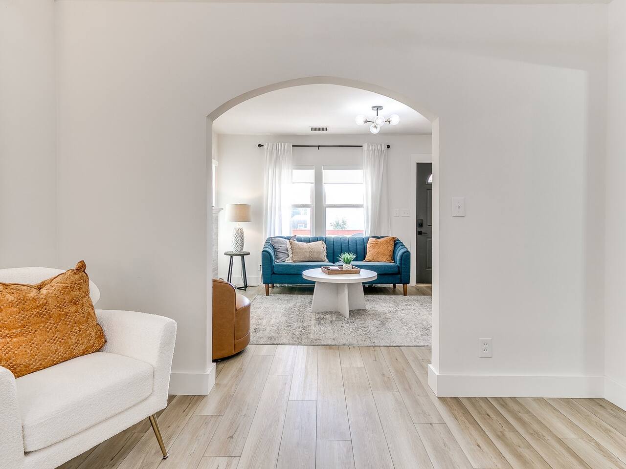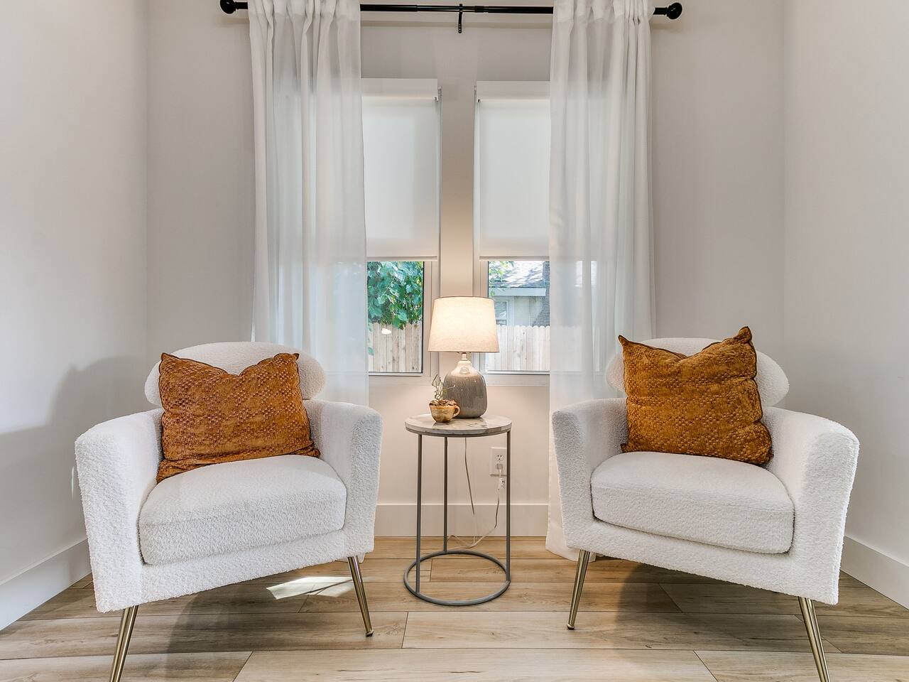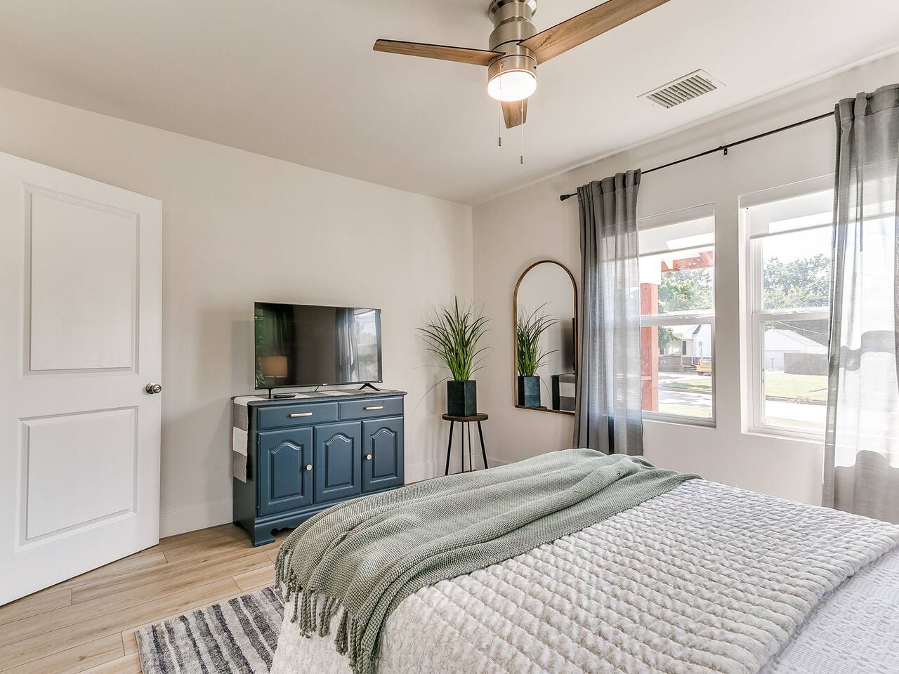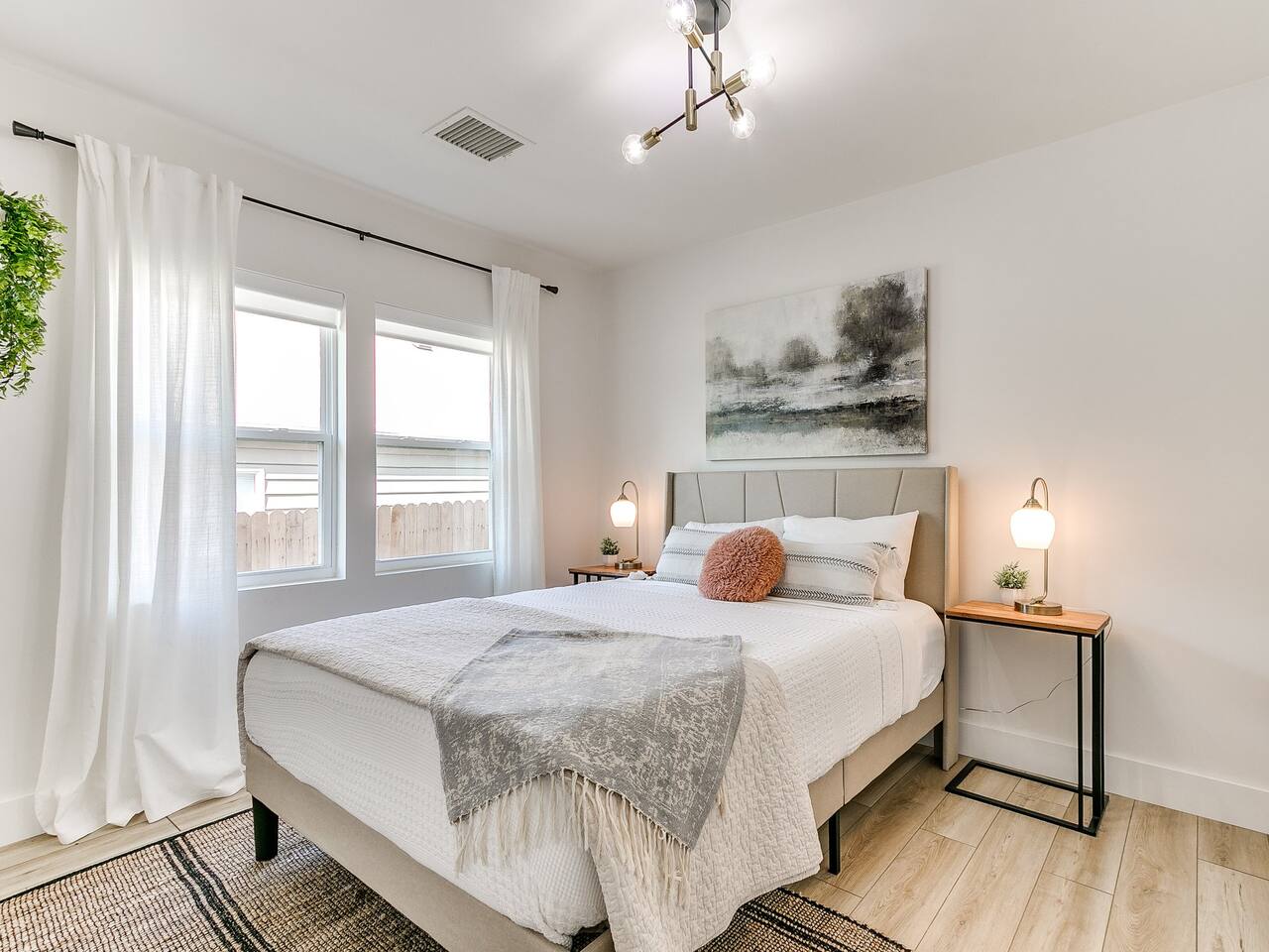 The Space: The Uptown Cottage is equipped with 3 bedrooms, 2 baths, dining area, a full kitchen with all the amenities and an outdoor front and back porch with a grill. Brand new central air system to keep you cool. The home has all brand-new furniture including super comfy beds for a great night sleep after your day of recreation. Smart TVs and high speed Wifi throughout the home. Easy, one level living in this bright airy home. Sheets and towels are all included as well as the use of the washer and dryer if needed. LIVING ROOM: Newly remodeled, bright and airy space with a contemporary design. The living room flows into another sitting area with separate working space and a desk if you are here on business. KITCHEN: Fully equipped kitchen with brand new appliances and plenty of workspace. Also a coffee bar area to brew the good stuff. Great place to make a meal or hang around together. DINING AREA: Dining table seats 6. The open floor plan provides easy access between our kitchen, living room and dining area. PRIMARY BEDROOM: To ensure your comfort, our home is outfitted with luxury mattresses, quality linens, and great pillows, all cleaned to the highest standards. Our primary bedroom has a queen size bed, dresser and plenty of space for storage as well as a smart TV for you. FULL BATH Updated and remodeled beautiful bathroom with tub/shower combo. All towels and amenities are selected with you in mind. QUEEN BEDROOM 1: Queen bedroom with high end cooling gel mattress, dresser and closet space provide our guests with a cozy and comfortable experience. QUEEN BEDROOM 2 On the rear side of the house, this bedroom is great for additional guests. High end bedding and plenty of storage for your stuff. HALF BATH: Another half bath with vanity. This can be used by any of the other guest and is conveniently located off the main section of the home. Quality towels and amenities provide. OUTDOOR AREA/BACKYARD: Our home offers outdoor space to enjoy. Our fenced-in yard boasts a covered patio with a seating area and a gas grill, and plenty of space for everyone.